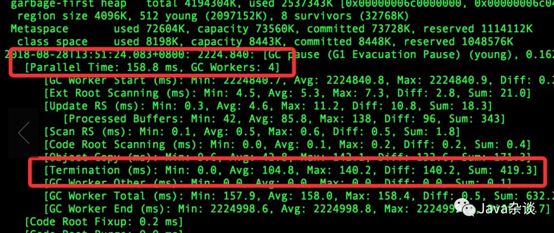 因为gc log中只能看到GC总时间看不到哪个阶段出现问题,所以把垃圾回收齐切换到G1,看到的log如下: