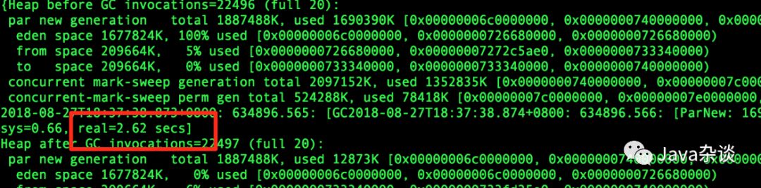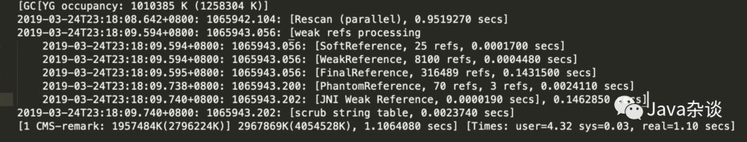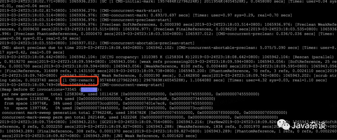 群里有人使用到了Swap区域。而对CMS GC如果有了解的话,想问的肯定是是不是加了“-XX:+CMSScavengeBeforeRemark”这个参数。在明确告知有这个参数。但是我在这个remark阶段并没有看到young gc,提问者就又截了一个全一点的日志,如下: