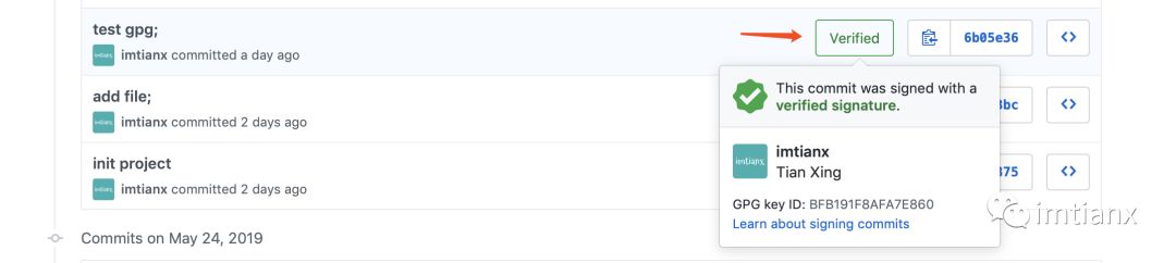 然后在使用的时候,commit 记录就会有校验通过的标识,如下: