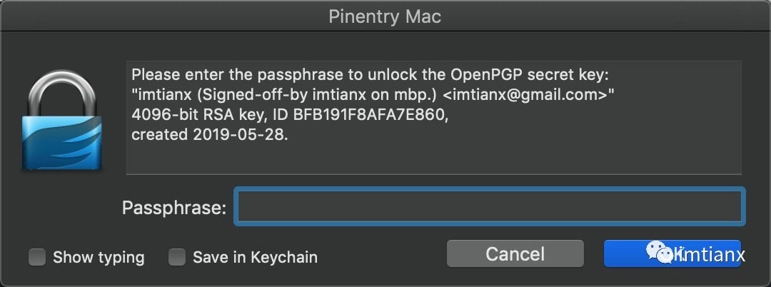 然后,测试 gpg ,弹出密码框并确认输入后可暂时解决,如下测试示例: