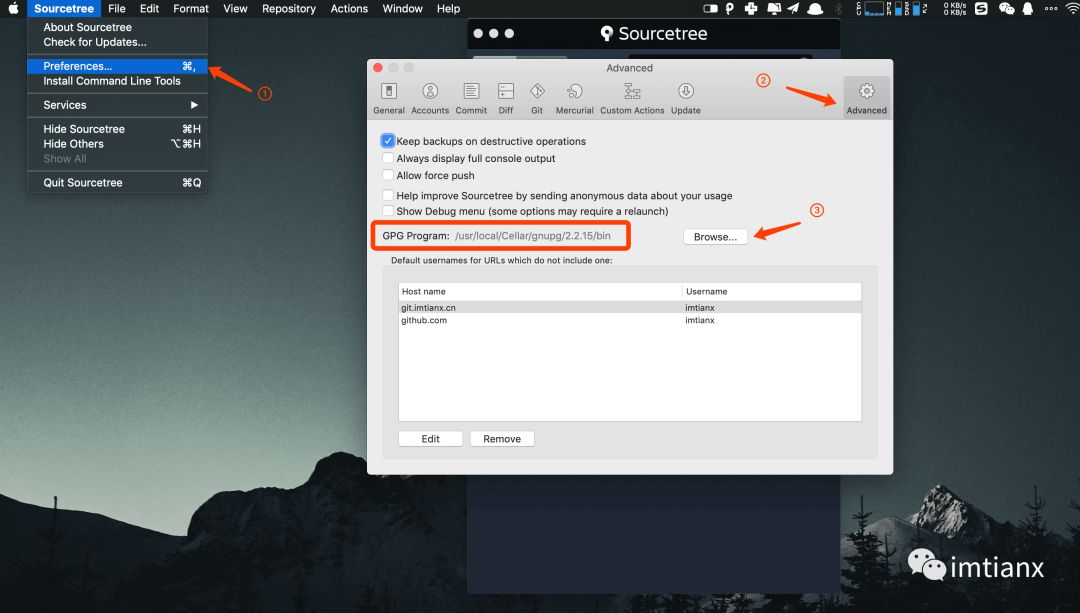 与 Git 设置相比,这里较为麻烦。首先,Sourcetree 默认支持 gpg2,这里需要设置 gpg2 的软连接否则 sourcetree 无法识别: