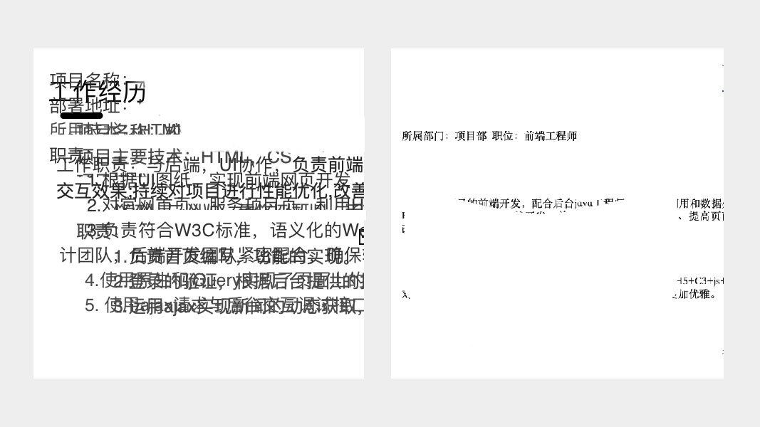 首先,负责人关注的,是你的右侧,你的左侧基本一带而过,左侧占了几本3分之1篇幅,低效率。技能不明确,搞啥进度条,篇幅太短,空间不够写不下了吧。