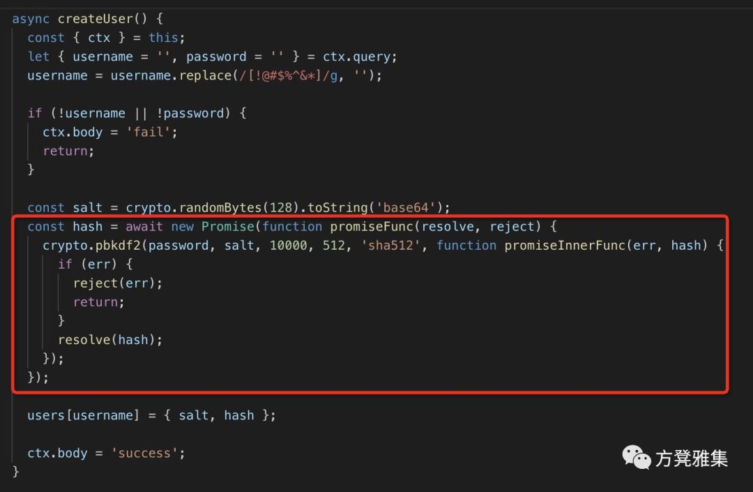 结合上面的分析,可以知道createUser中pbkdf2Sync消耗了大量时间,那么该如何优化呢?这里之所以导致应用性能不好,每秒只能处理22.9个请求,主要是因为pbkdf2Sync非常消耗CPU的计算资源,而且是同步的。这里我们可以将其改成异步,具体修改如下: