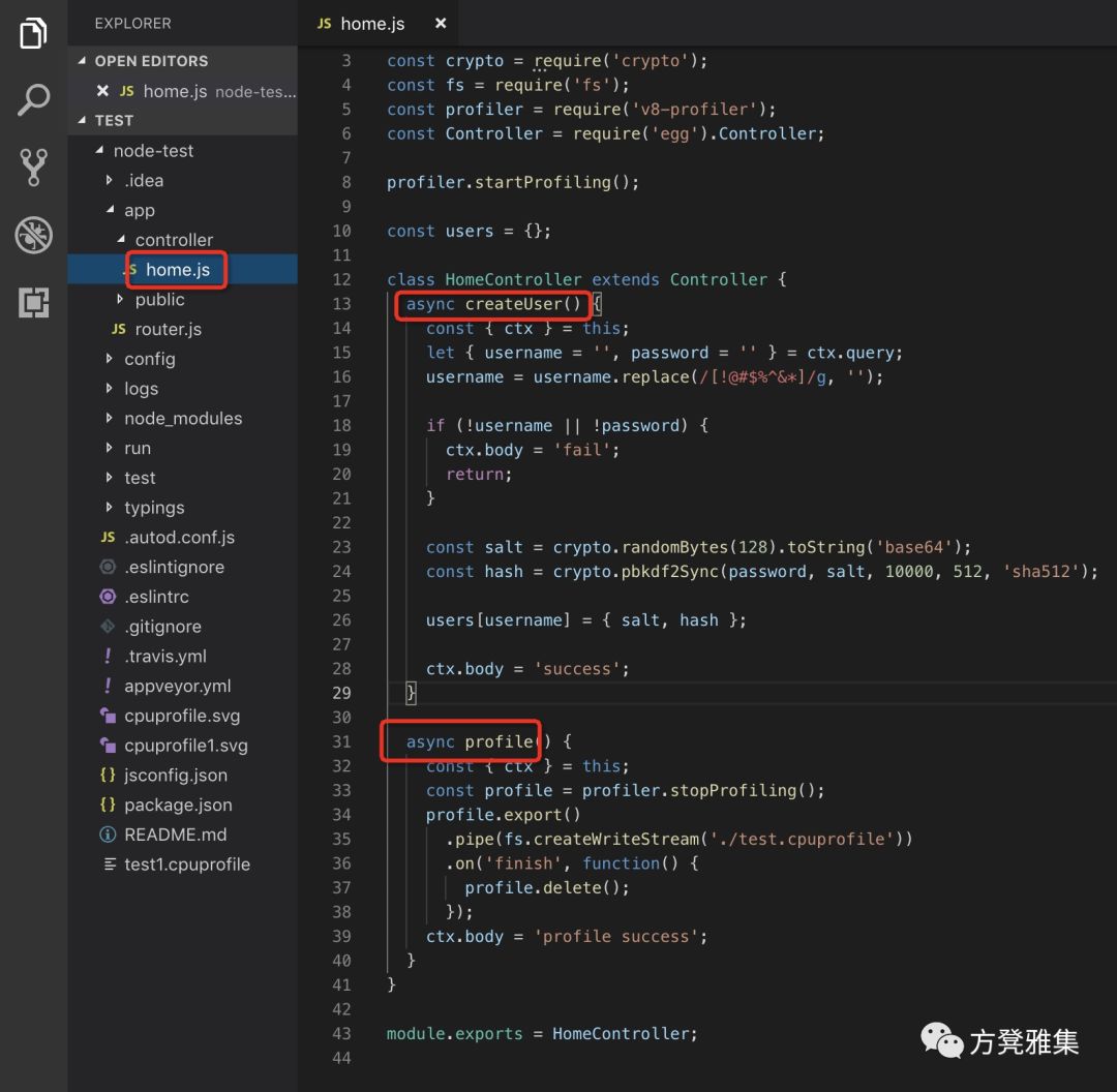 从图中我们可以看到controller目录下有一个home.js文件,该文件下有一个HomeController类,这个类里面有两个方法:createUser和profile。createUser这个方法用crypto.pbkdf2Sync对password进行加密,然后保存在users这个全局对象中;profile这个方法利用v8-profiler收集CPU运行时的信息,并保存到test.cupprofile文件中。