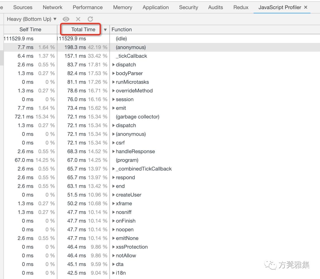 以Total Time排序(包含其调用函数的时间)看看具体的情况,可以看出(anonymous)和_tickCallback分别消耗了42.19%和33.42%的时间。
