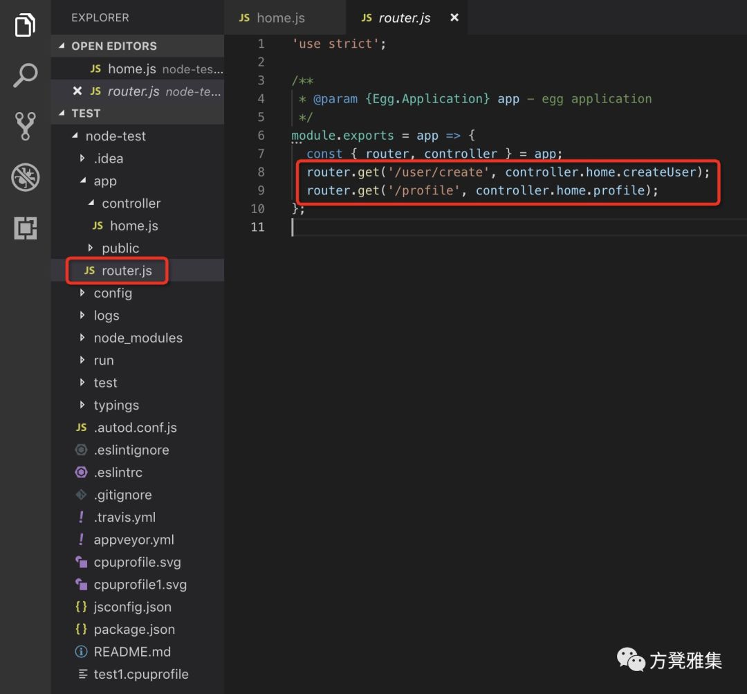 接下来还需要看一下router.js,这个文件是用来将路由和controller目录下的代码关联起来。比如访问/user/create,就会去调用上面提到的createUser方法;访问/profile,就会调用上面提到的profile方法。