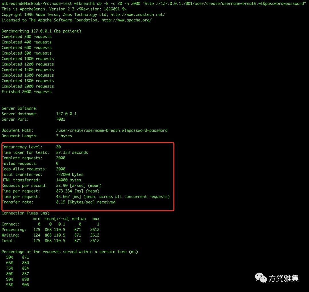 接下来,让我们开始收集数据吧。首先通过”npm run start“命令启动egg应用,然后通过”ab -k -c 20 -n 2000 "http://127.0.0.1:7001/user/create?username=breath.wl&password=password"“模拟并发请求,其中”-n“表示发出2000个请求,”-c“表示并发请求数为20,”-k“表示http请求采用keep-alive方式。运行完该命令我们会得到以下结果: