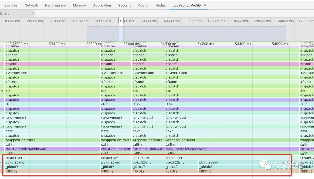 这密密麻麻的,说实话看着就有点头疼,还是让我们缩小一下范围吧。从下图中仍然可以看出pbkdf2Sync仍然是消耗时间的大头,并且几乎占据了createUser所有时间。