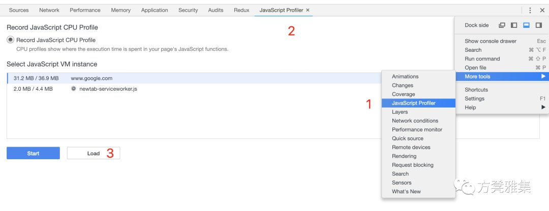 已经得到test1.cpuprofile文件了,接下来就可以利用Chrome开发者工具中的JavaScript Profiler对其进行分析了,通过下图的步骤加载文件: