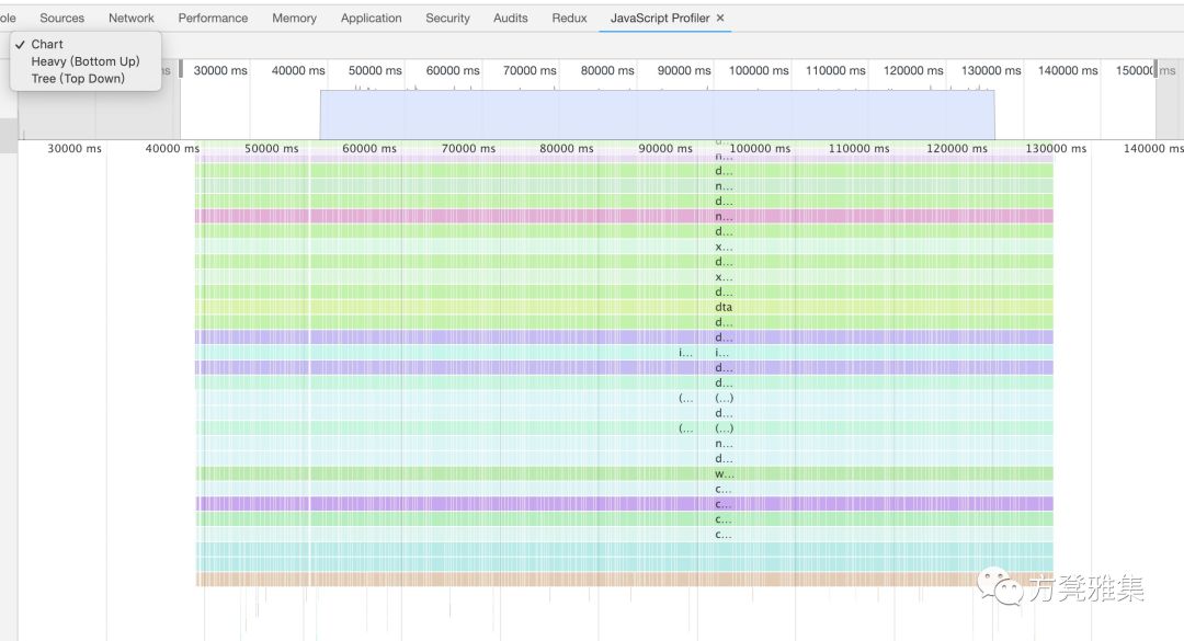 除了从Heavy (Bottom Up)这个选项,让我们还从火焰图的角度分析一下,选择Chart选项,会得到如下图。