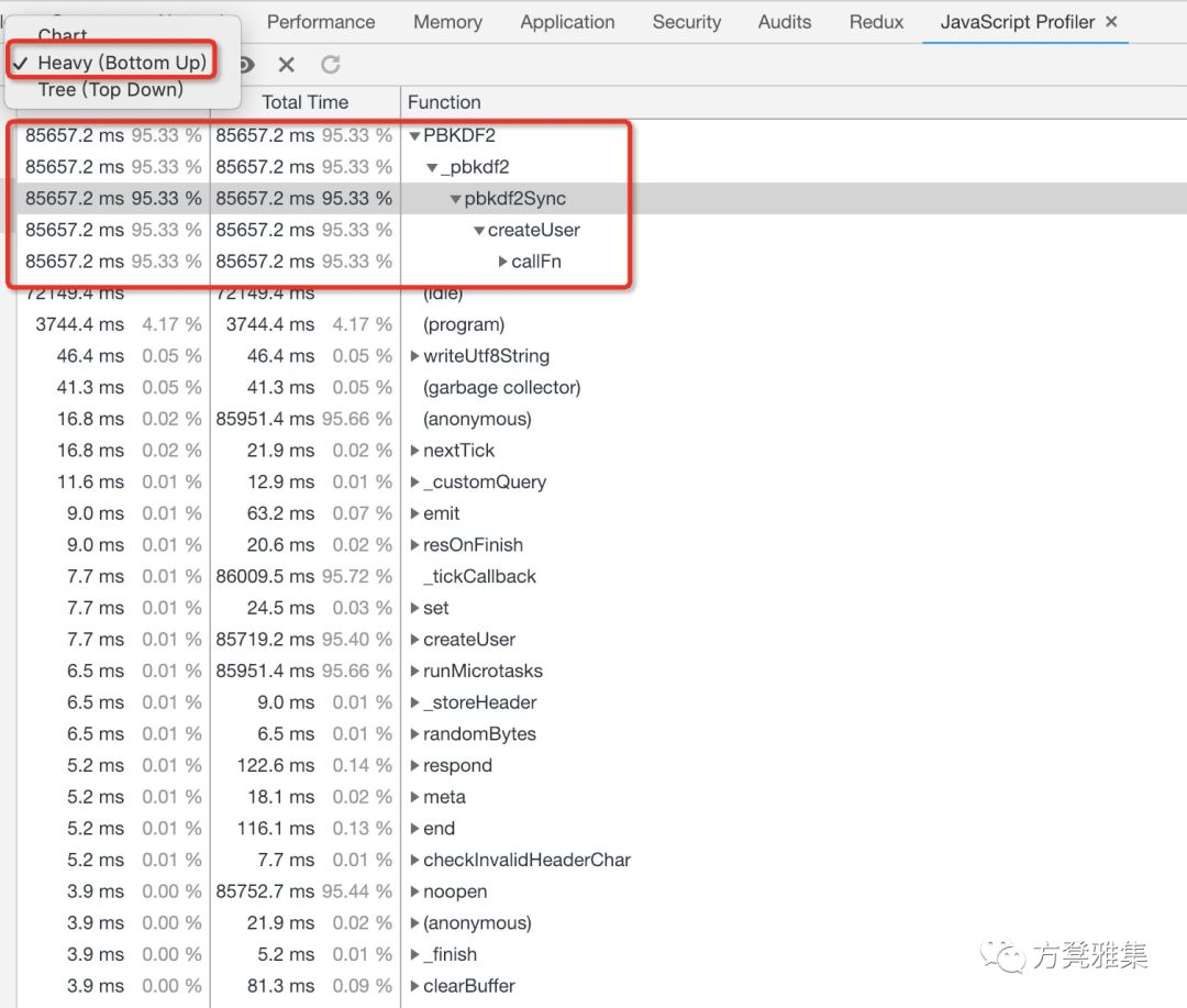 加载完毕之后,选择Heavy (Bottom Up)选项,会得到如下图,这个选项将函数按照耗时的顺序从高到底进行排序,点开还可以看到该函数的调用栈。从图中可以看到PBKDF2耗时占据95.33%,点开可以看到该函数被createUser函数中的pbkdf2Sync调用。