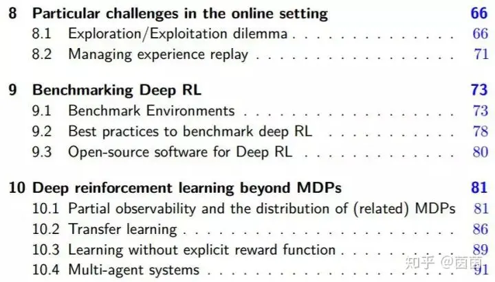 第十章会讨论比 MDP 更一般的设定:(1)部分可观察马尔可夫决策过程(POMDP),(2)MDP 的分布(而不是给定的 MDP)与迁移学习的概念,(3)无明确奖励函数的学习,(4)多智能体系统。我们会描述如何在这些设定中使用深度强化学习。