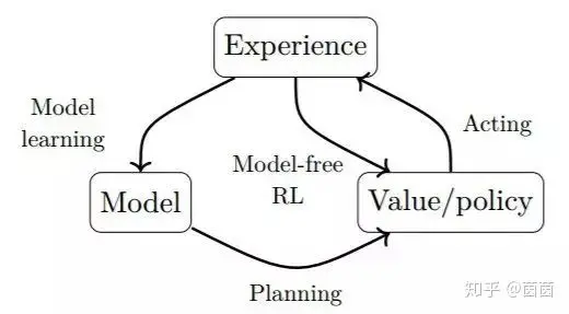 图 3.3:强化学习不同方法的一般模式。直接方法是使用价值函数或策略的表征来在环境中活动。间接方法是使用环境的模型。