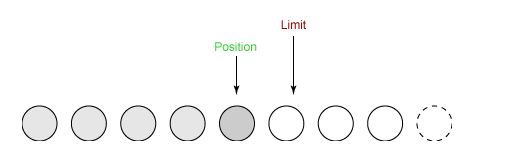 ① 新建一个大小为 8 个字节的缓冲区,此时 position 为 0,而 limit = capacity = 8。capacity 变量不会改变,下面的讨论会忽略它。
