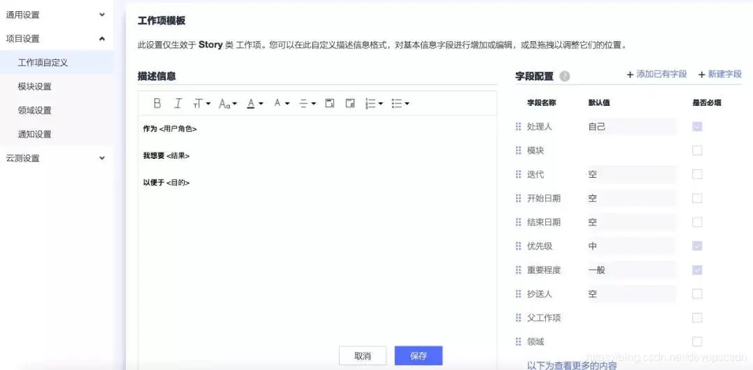 DevCloud支持工作项模板,在设置->项目设置中,可以看到如何将用户故事的三段式,预置在Story的工作项模板中,用户也可以根据需要自行定义描述信息。