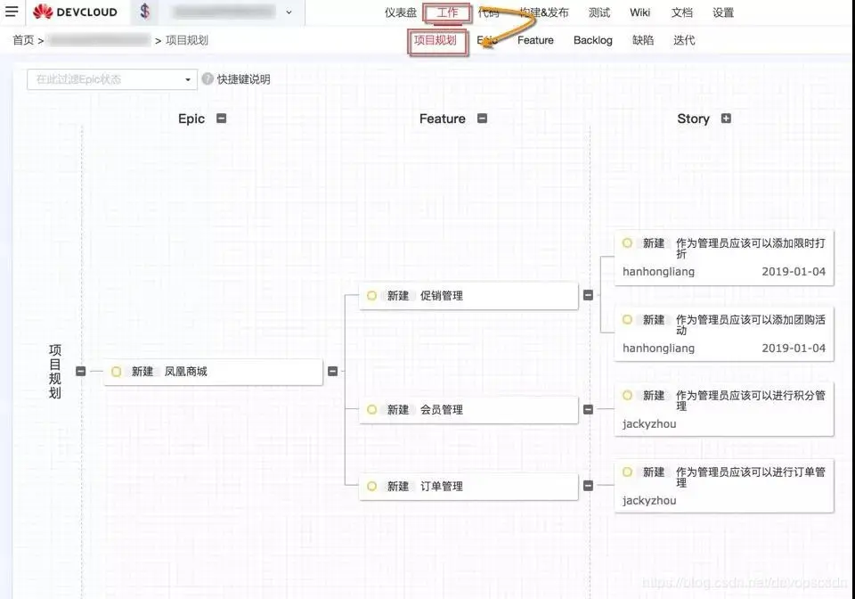 从Epic-Feature-Story的拆分,可以在项目规划里以脑图的形式进行,一目了然。