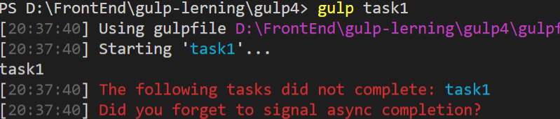 (1)串行(顺序)执行,与gulp3中顺序执行不同,先开始default任务,再顺序执行task1、task2任务,最后结束default任务。
