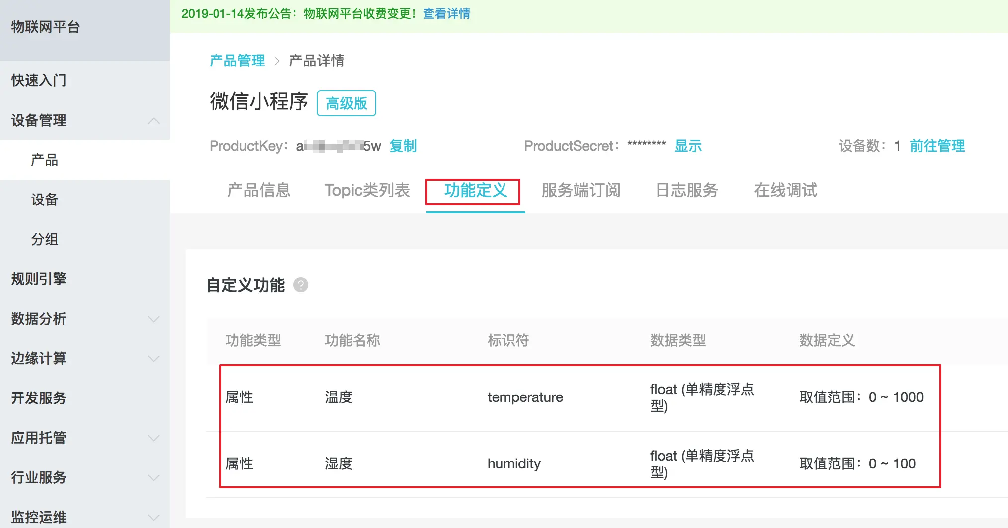 添加产品属性温度 temperature,湿度 humidity