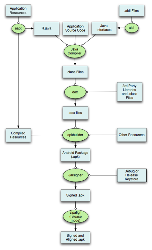 - apkbuilder 工具将.dex 文件和编译后的资源文件生成未经签名对齐的apk文件,这里编译后的资源文件包括两部分,一是由aapt编译产生的编译后的资源文件,二是依赖的三方库里的资源文件,产生为未经签名的apk文件。