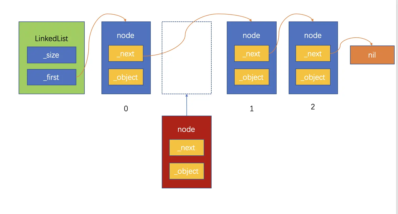 在链表中间插入节点,如下图,链表中存在三个节点,此时我们需要在链表index为1的位置插入一个节点: