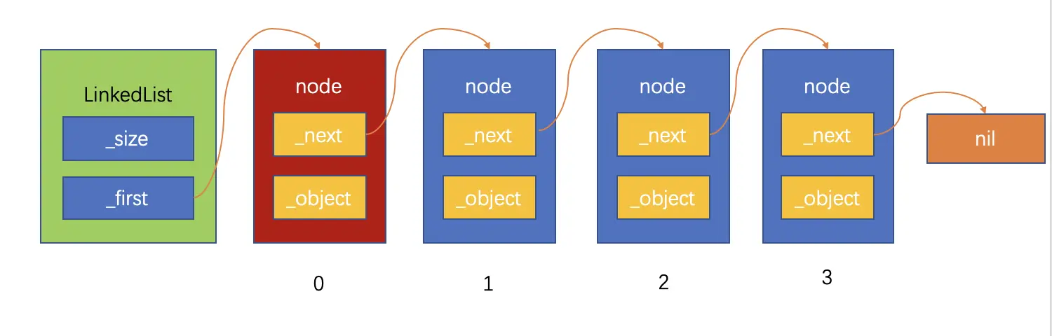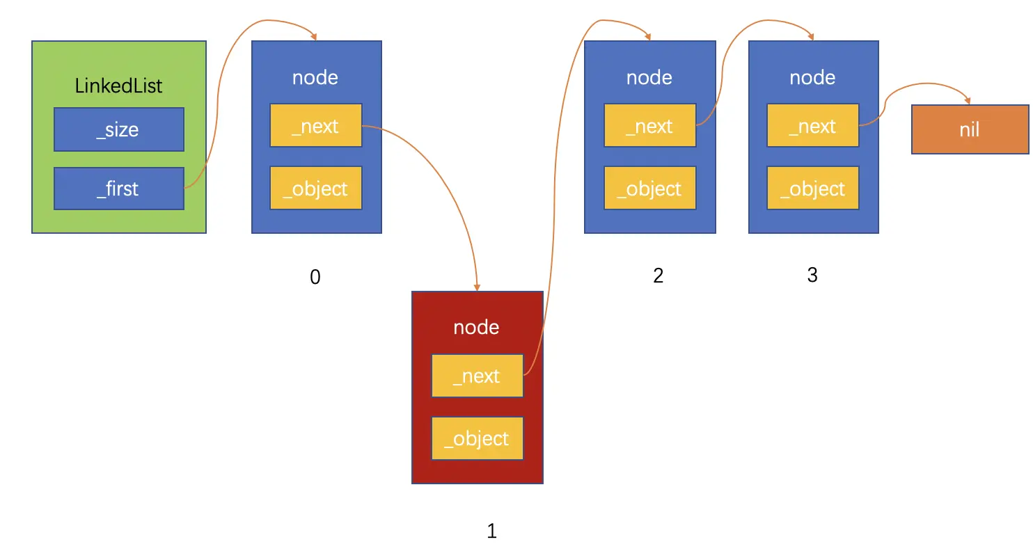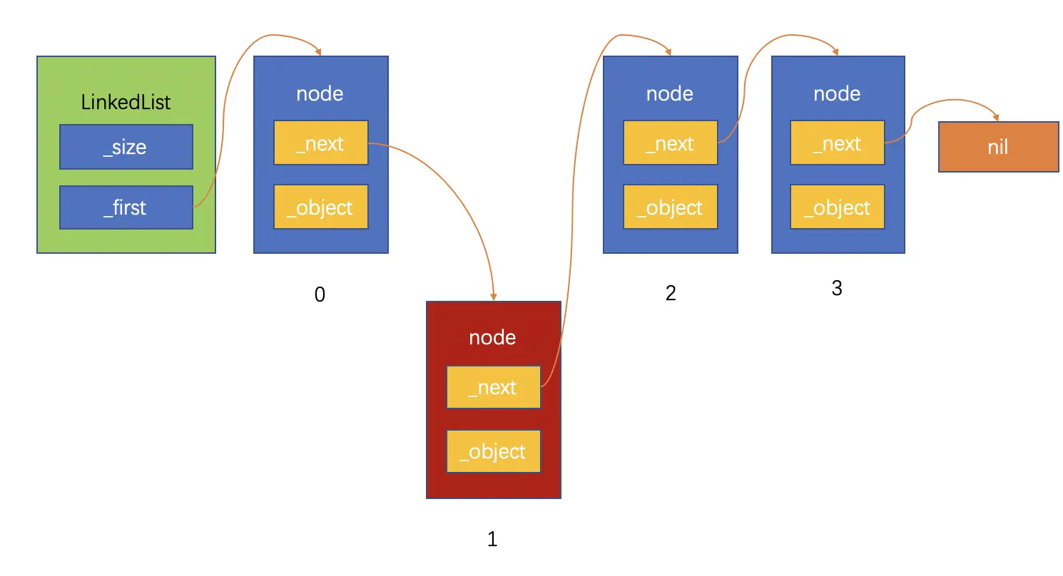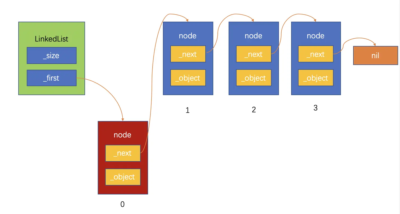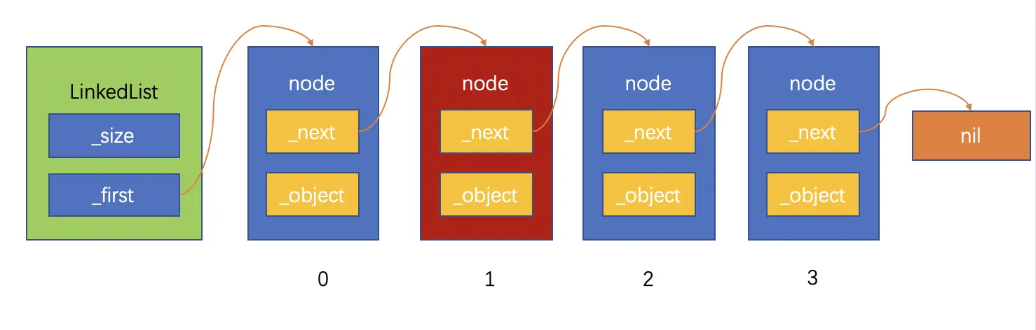 上面的链表结构图可以看到,链表对象保存这链表的长度和链表的头节点,如果要通过index获得具体的某一个节点,需要从头节点开始逐一通过next指针往后查找,直到找到第index个节点。