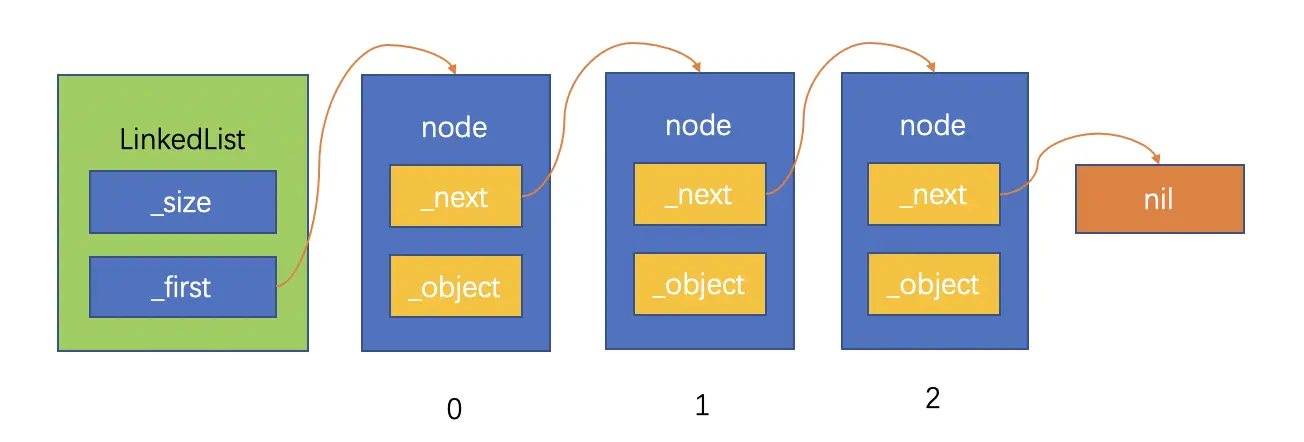 既然只需要拿到单向链表的头节点,就能够访问到全部节点,那么单向链表中需要存储成员变量只需要两个,一个是 _size,存储这链表的长度。另一个是_first,保存链表的第一个节点。