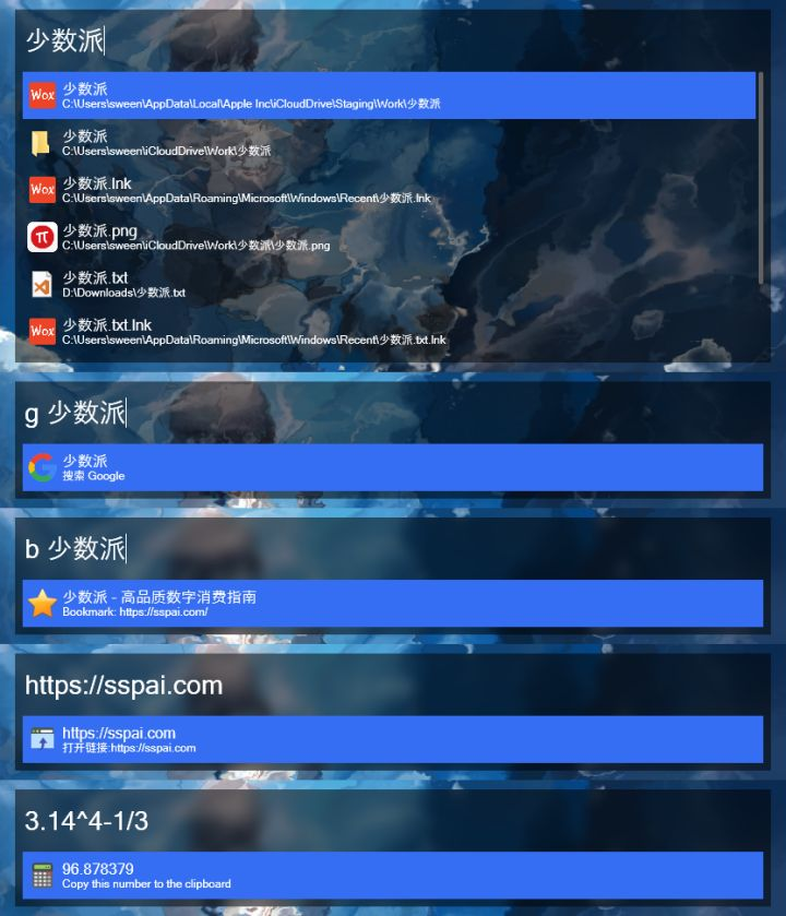 Wox 是一款国人开发的免费开源快捷启动器,类似于 macOS 上的效率神器 Alfred(还没听说过 Alfred?欢迎 点此 了解)。它可以调用 Everything 快速搜索本地文件,也可以启动程序、执行命令行、进行网页搜索等,非常强大。