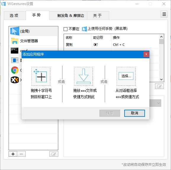 当然,你也可以根据自己的实际需要来定制专属于你的鼠标手势,你还可以为专为某个应用程序设置鼠标手势,或者在某个程序中禁用手势。WGestures 支持上下左右及斜向的8种基本手势,配合鼠标右键及中键滚动操作,可以轻松实现各种复杂手势及操作。