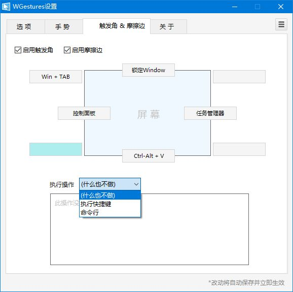 此外,WGestures 的另一个实用功能是摩擦角和触发边。你可以通过设置让鼠标移动到四角或在边界上摩擦时执行指定命令,不需要点击按键。