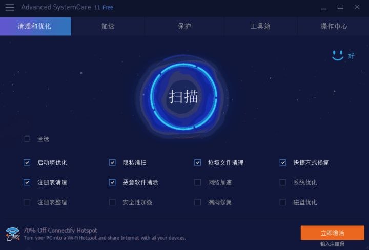 Advanced SystemCare 是一款出自 IObit 之手的优秀系统优化软件。提供了清理优化、系统加速、简单的系统保护等功能,界面简单干净,清理速度快。Free 版本就能完成大部分清理工作,并对常用功能进行优化。