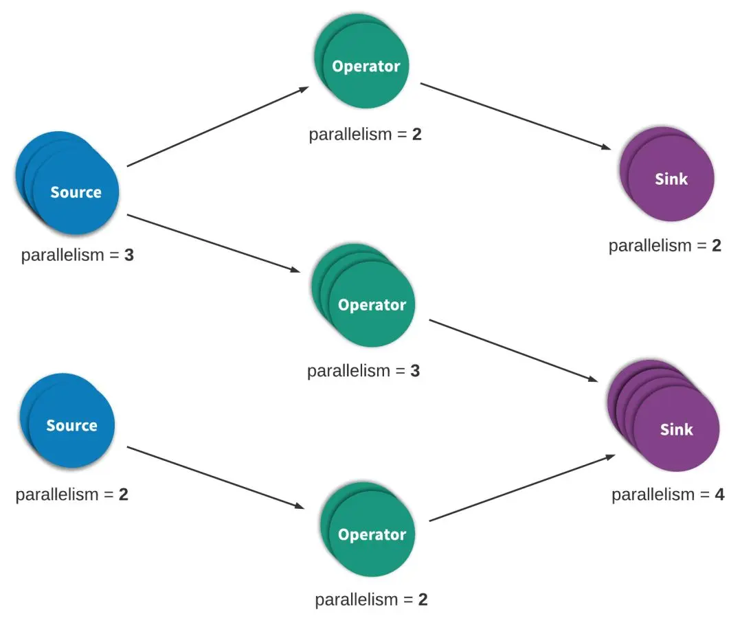 流处理(有时称为事件处理)可以简单地描述为是对无界数据或事件的连续处理。流或事件处理应用程序可以或多或少地被描述为有向图,并且通常被描述为有向无环图(DAG)。在这样的图中,每个边表示数据或事件流,每个顶点表示运算符,会使用程序中定义的逻辑处理来自相邻边的数据或事件。有两种特殊类型的顶点,通常称为 sources 和 sinks。sources读取外部数据/事件到应用程序中,而 sinks 通常会收集应用程序生成的结果。下图是流式应用程序的示例。
