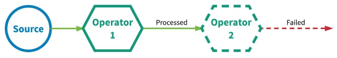 这本质上是一『尽力而为』的方法。保证数据或事件最多由应用程序中的所有算子处理一次。 这意味着如果数据在被流应用程序完全处理之前发生丢失,则不会进行其他重试或者重新发送。下图中的例子说明了这种情况。