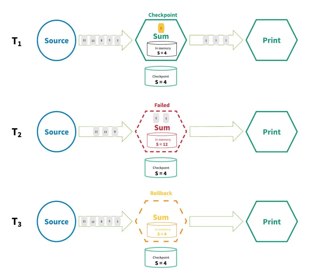 在上图中,流应用程序在 T1 时间处正常工作,并且做了checkpoint。然而,在时间 T2,算子未能处理输入的数据。此时,S=4 的状态值已保存到持久存储器中,而状态值 S=12 保存在算子的内存中。为了修复这种差异,在时间 T3,处理程序将状态回滚到 S=4 并“重放”流中的每个连续状态直到最近,并处理每个数据。最终结果是有些数据已被处理了多次,但这没关系,因为无论执行了多少次回滚,结果状态都是相同的。