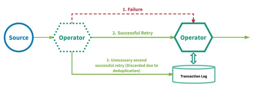 另一种实现『精确一次』的方法是:在每个算子上实现至少一次事件传递和对重复数据去重来。使用此方法的流处理引擎将重放失败事件,以便在事件进入算子中的用户定义逻辑之前,进一步尝试处理并移除每个算子的重复事件。此机制要求为每个算子维护一个事务日志,以跟踪它已处理的事件。利用这种机制的引擎有 Google 的 MillWheel[2] 和 Apache Kafka Streams。下图说明了这种机制的要点。