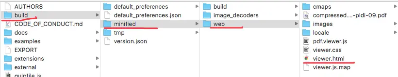 图中红线标注的 viewer.html 就是最终我们用来加载显示 pdf 文件的入口 html 文件。