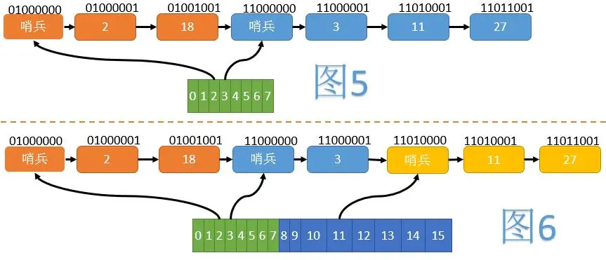 如图5,我们将所有节点按照Hash值的翻转位序(如1101->1011)由小到大排列。当数组大小为8时,2、18在一个组内;3、11、27在另一个组内。每组的开始,插入一个哨兵节点,以方便后续操作。为了使哨兵节点正确排在组的最前方,我们将正常节点Hash的最高位(翻转后变为最低位)置为1,而哨兵节点不设置这一位。