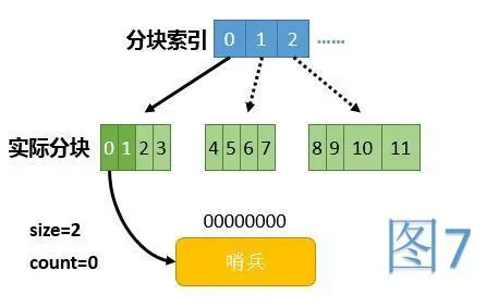 初始时,数组中除第0项外,所有项都为null。第0项指向一个仅有一个哨兵节点的链表,代表整条链的起点。初始时全貌见图7,其中浅绿色代表当前未使用的下标范围,虚线箭头代表逻辑上存在,但实际未建立的块。