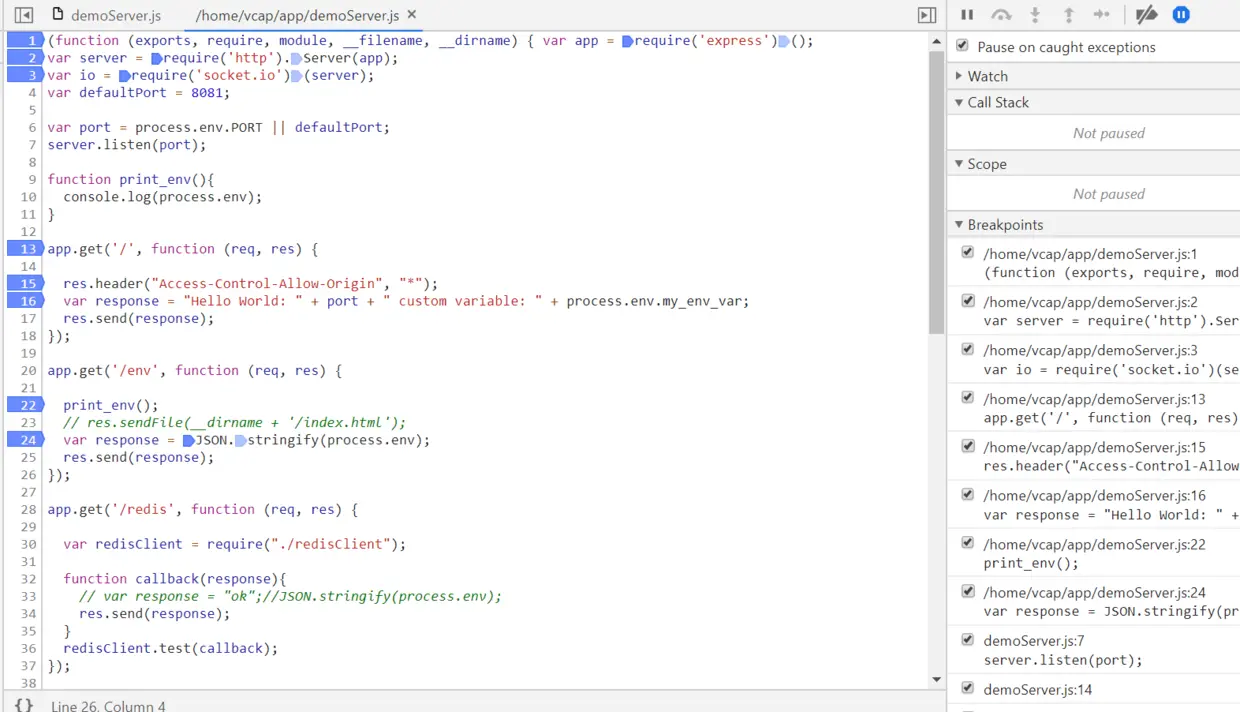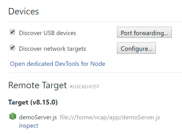 接下来,我们在Chrome地址栏输入chrome://inspect, 即可看到运行在CloudFoundry上的应用已经可以本地调试了: