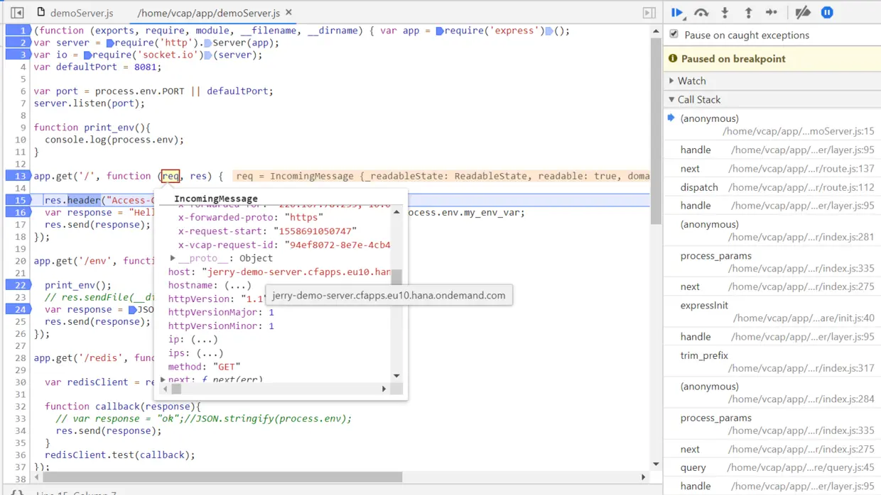 然后在浏览器里再次输入应用的url,断点触发,就可以开始远程调试了: