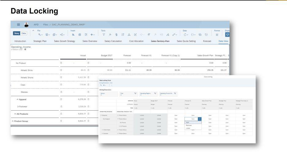 在预测过程中,多个计划人员提供其责任区域的数字,职责区域由流程控制器定义,并由数据锁定强制执行。数据锁定适用于每个计划模型。“驱动维度”定义了可以设置锁定的粒度级别。每个单元可以具有多个锁定状态(打开,锁定和受限)。在计划过程中,可以由特殊的“所有者”编辑受限制的单元格。数据锁定提供了针对模型的多维切片数据更新的精细控制。我们可以针对任意数量维度(例如版本,时间,成本中心等)锁定和解锁数据,并在网格内为可编辑的切片和锁定的切片提供可视化提示。一旦计划的给定切片完成(例如版本和成本中心),模型所有者或管理员就可以锁定用户对该切片的进一步编辑。还能将节点置于受限制的编辑模式,从而只有被授权的用户才能进一步编辑数据。锁定状态可以在表格/报表中可视化以指示状态并为计划用户提供指导。
