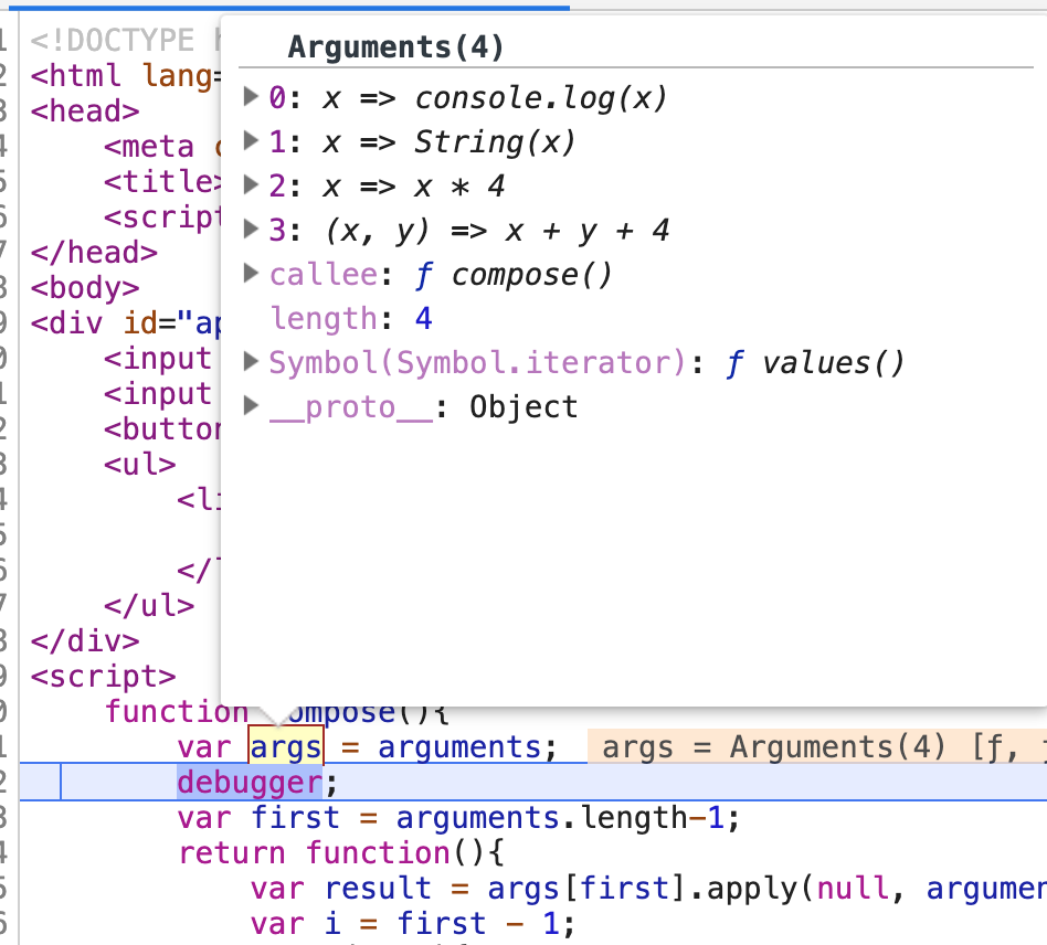 args[first].apply(null,arguments)=>等于调用 result = add(1,3)=>1+3+4;