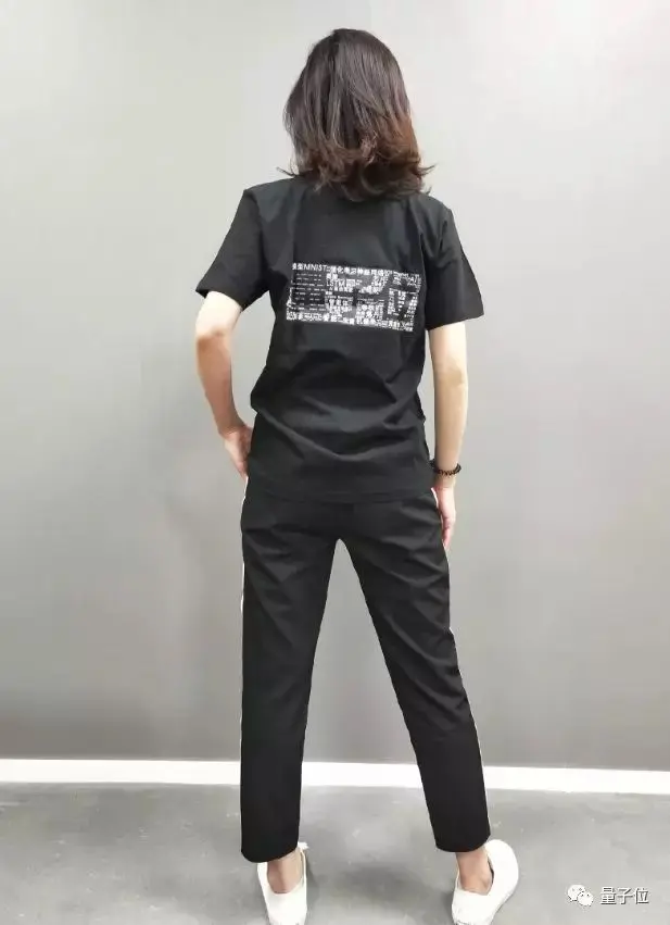 T恤背面图案是由AI相关的词语无规则堆叠,形成镂空的“量子位”。