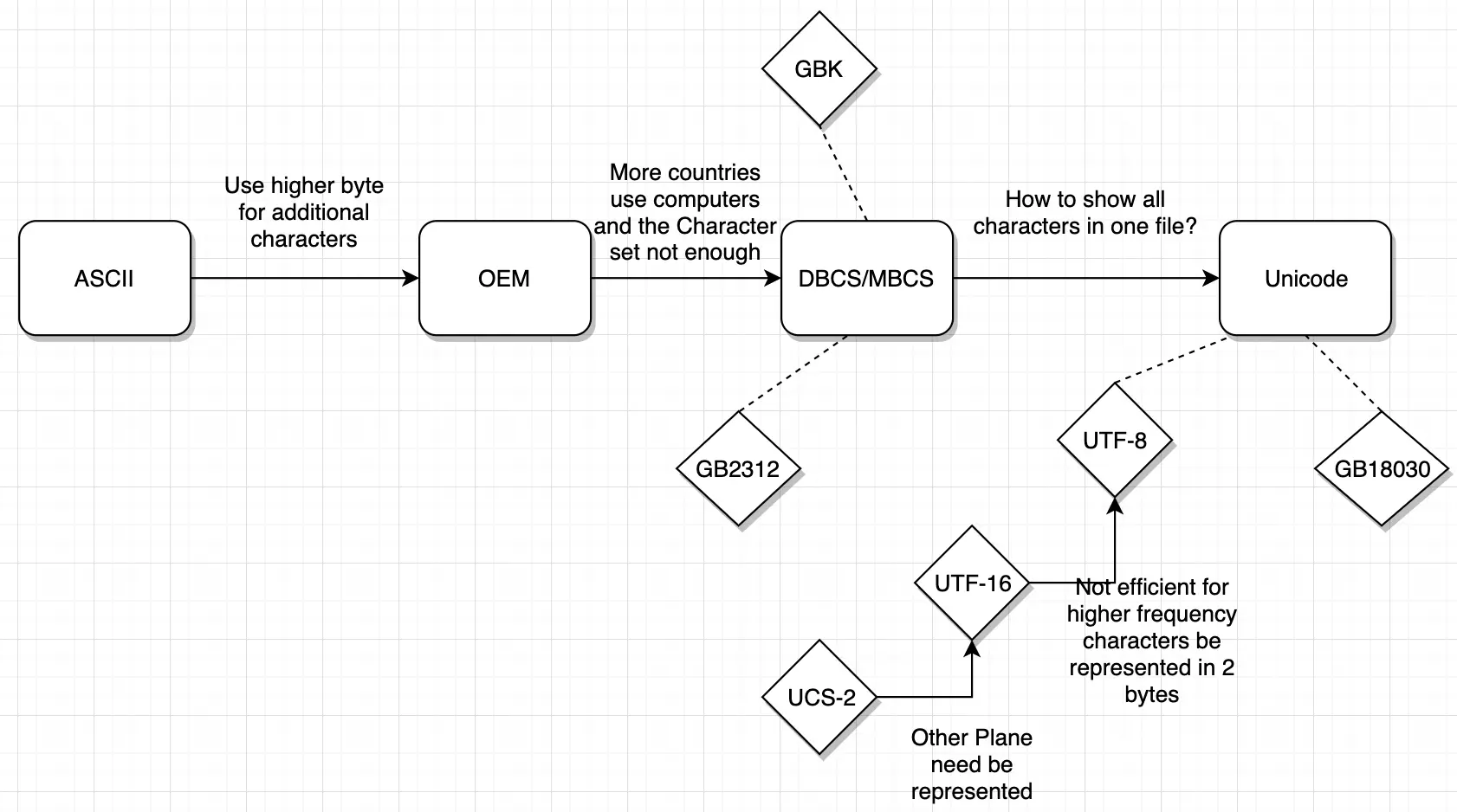 下面是我画的一张图,算是一个小型知识地图吧,可以大概描述字符编码的演变,以及相关编码方法的由来,可以先看看,图中的文字描述是指遇到的问题