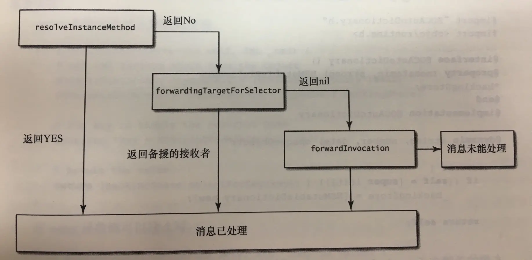 - 先请接收者看看有没有其他对象能处理这个条消息. 若有, 则运行期系统会把消息转给那个对象. 若没有"备援的接收者", 这启动完整的消息转发机制,运行期系统会把与消息有关的全部细节都封装到NSInvocation对象中,再给接收者最后一次机会, 令其设法解决当前还未处理的这条消息