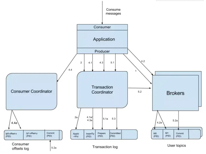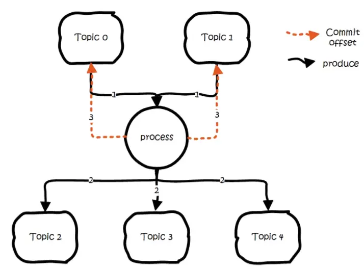 其中第2、3点作为一个事务,要么全成功,要么全失败。这里得益与offset实际上是用特殊的topic去保存,这两点都归一为写多个topic的事务性处理。