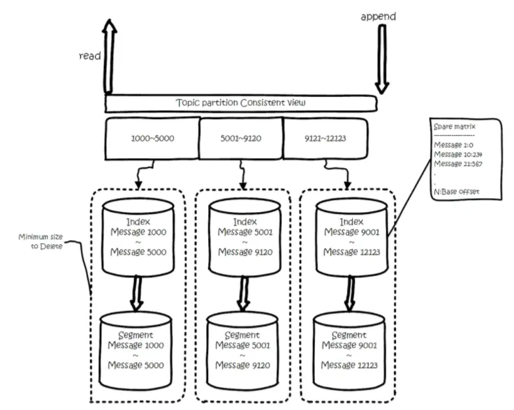 为了减少索引文件的大小,降低空间使用,方便直接加载进内存中,这里的索引使用稀疏矩阵,不会每一个message都记录下具体位置,而是每隔一定的字节数,再建立一条索引。 索引包含两部分,分别是baseOffset,还有position。
