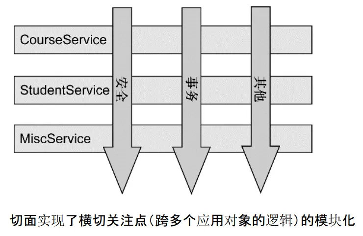 从该图可以很形象地看出,所谓切面,相当于应用对象间的横切点,我们可以将其单独抽象为单独的模块。