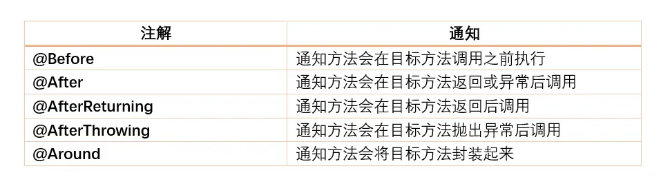 - 通知(Advice): AOP 框架中的增强处理。通知描述了切面何时执行以及如何执行增强处理。