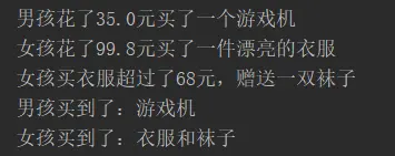 System.out.println("女孩买衣服超过了68元,赠送一双袜子");