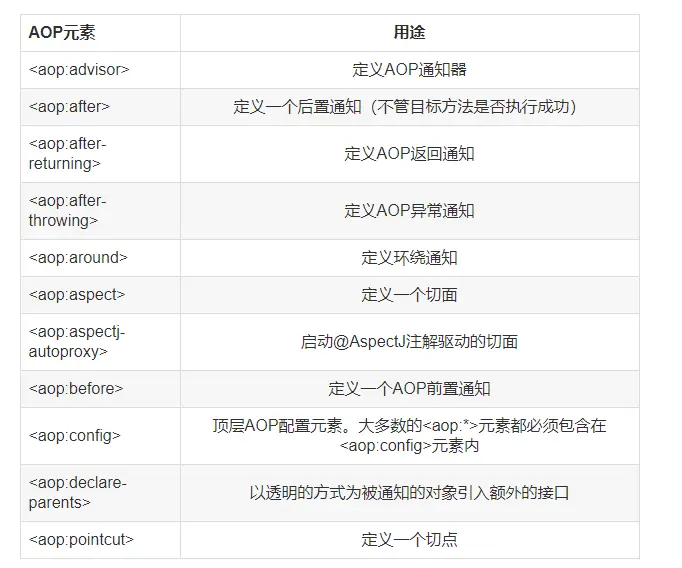 前面的示例中,我们已经展示了如何通过注解配置去声明切面,下面我们看看如何在 XML 文件中声明切面。下面先列出 XML 中声明 AOP 的常用元素: